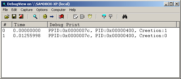 DbgPrint("PPID:0x%08x, PID:0x%08x, Creation:%d", ParentId, ProcessId, Create);