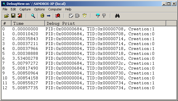 DbgPrint("PID:0x%08x, TID:0x%08x, Creation:%d", ProcessId, ThreadId, Create);