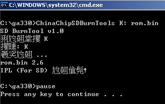 2. 使用2GB MiniSD(僅支援2GB以下)並執行ChinaChipSDBurnTool.bat(請修改裡面的MiniSD槽號碼),完成後如下圖: