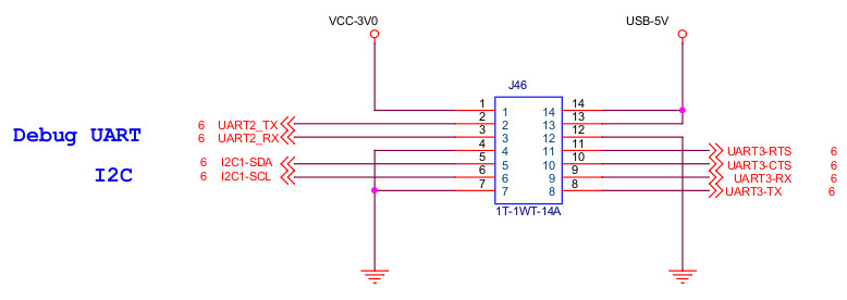 做了相當多的測試後,還是沒有任何UART輸出,而司徒正準備放棄時,意外發現J46的腳位順序好像是反的,因為1和4腳位應該是GND,但是司徒仔細看了一下PCB,發現GND的順序卻是如下所示: