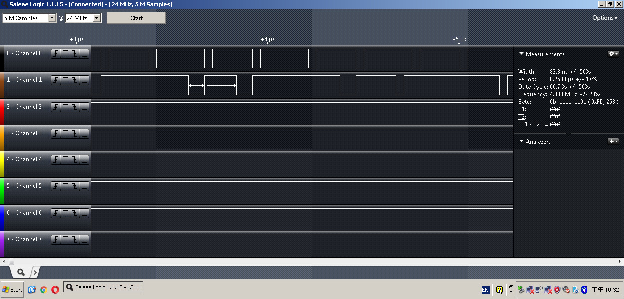 使用山寨邏輯分析儀測試LCD_WR腳位後,發現畫面更新是可以達到60fps,LCD_WR腳位Low的時間大約是80ns(Channel-0是AM335x LCD Clock 33MHz,而Channl-1則是MT7688 580MHz)。