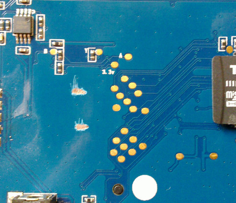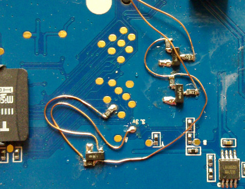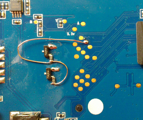 使用的控制腳位是LCD_SDA,因為這根腳位在初使化完屏幕就没有任何用途,因此相當適合拿來控制馬達,唯一的遺憾就是Kernel並没有回復腳位電位,因此,有些屏初使化後,維持高電位,有些則是低電位,造成硬體修改不一致,不過這部份可以由模擬器吸收,接著司徒挖兩個焊點用來擺放NPN電晶體