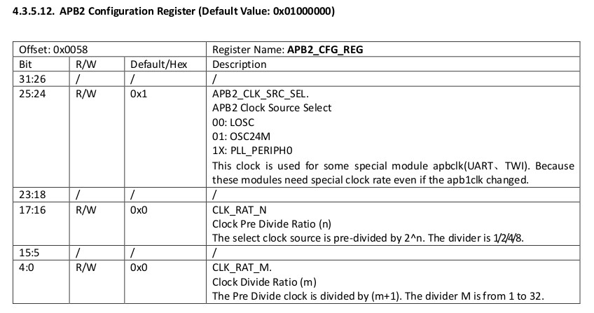 Baudrate = OSC24M/(16*divisor) = 24MHz/(16*13) = 115385 ~= 115200