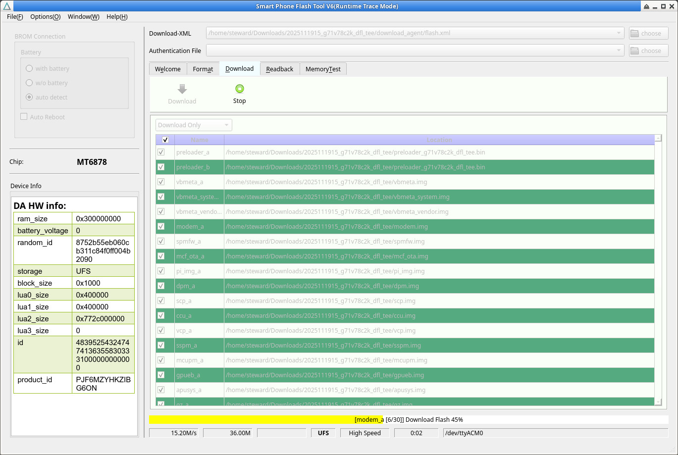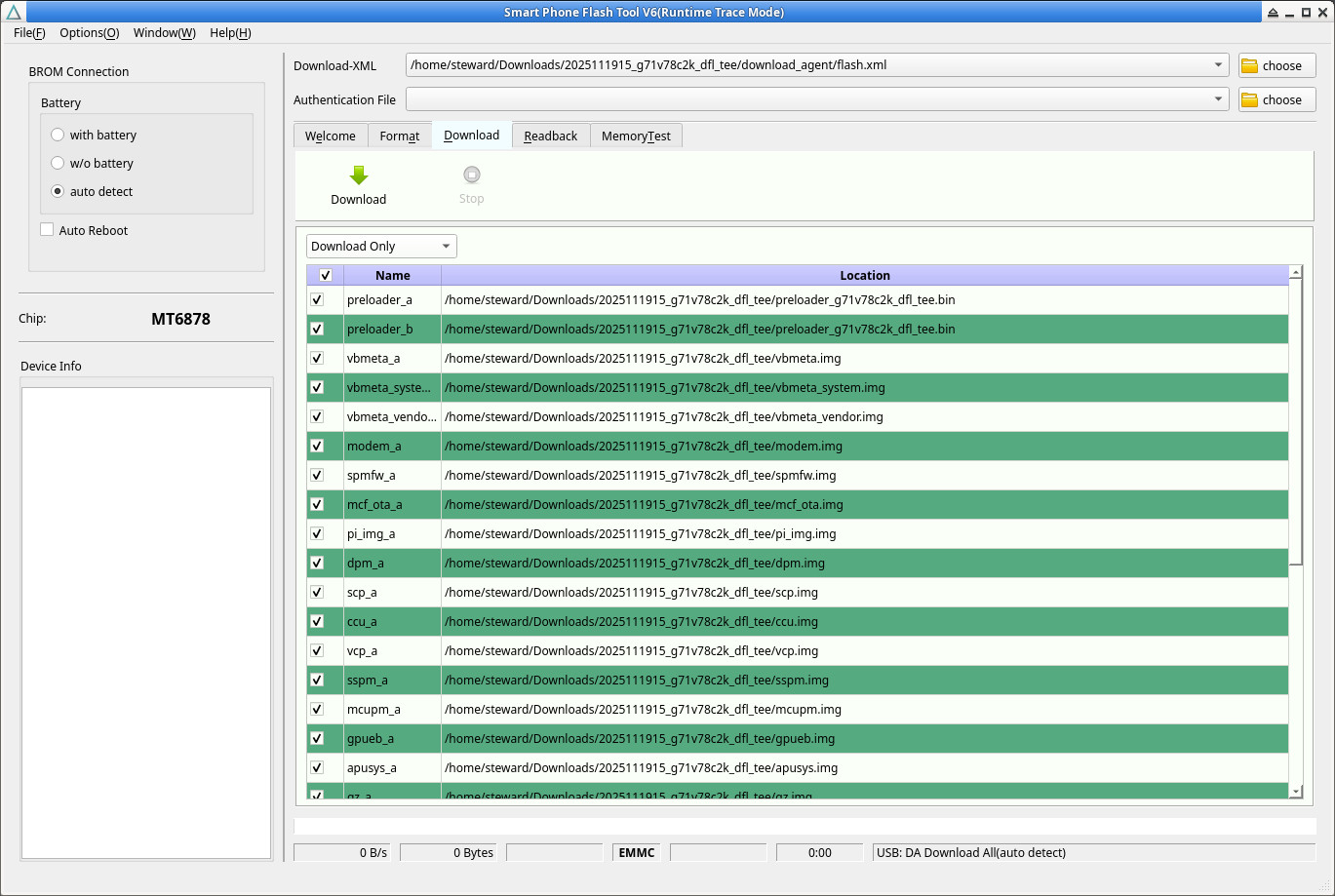 $ cd $ wget https://github.com/steward-fu/website/releases/download/titan2/SP_Flash_Tool_v6.2228_Linux.zip $ unzip SP_Flash_Tool_v6.2228_Linux.zip $ cd SP_Flash_Tool_v6.2228_Linux $ sh SPFlashToolV6.sh