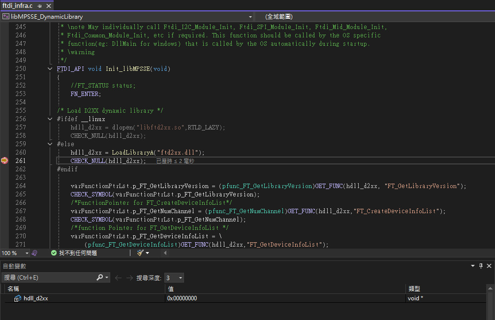 進入Init_libMPSSE()後,程式無法往下繼續執行