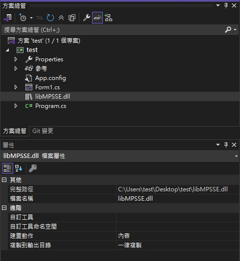6. 複製測試執行檔案到libMPSSE__0-6_Source\LibMPSSE\Build\Windows\VisualStudio\libMPSSE_DynamicLibrary\Debug下