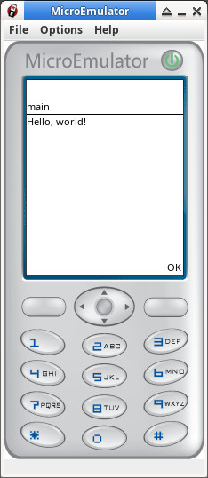 $ javac -classpath midpapi20-2.0.4.jar Hello.java $ jar cfm Hello.jar manifest.mf Hello.class $ java -cp microemulator-swing-2.0.4.jar:microemulator-2.0.4.jar:midpapi20-2.0.4.jar org.microemu.app.Main Hello.jar