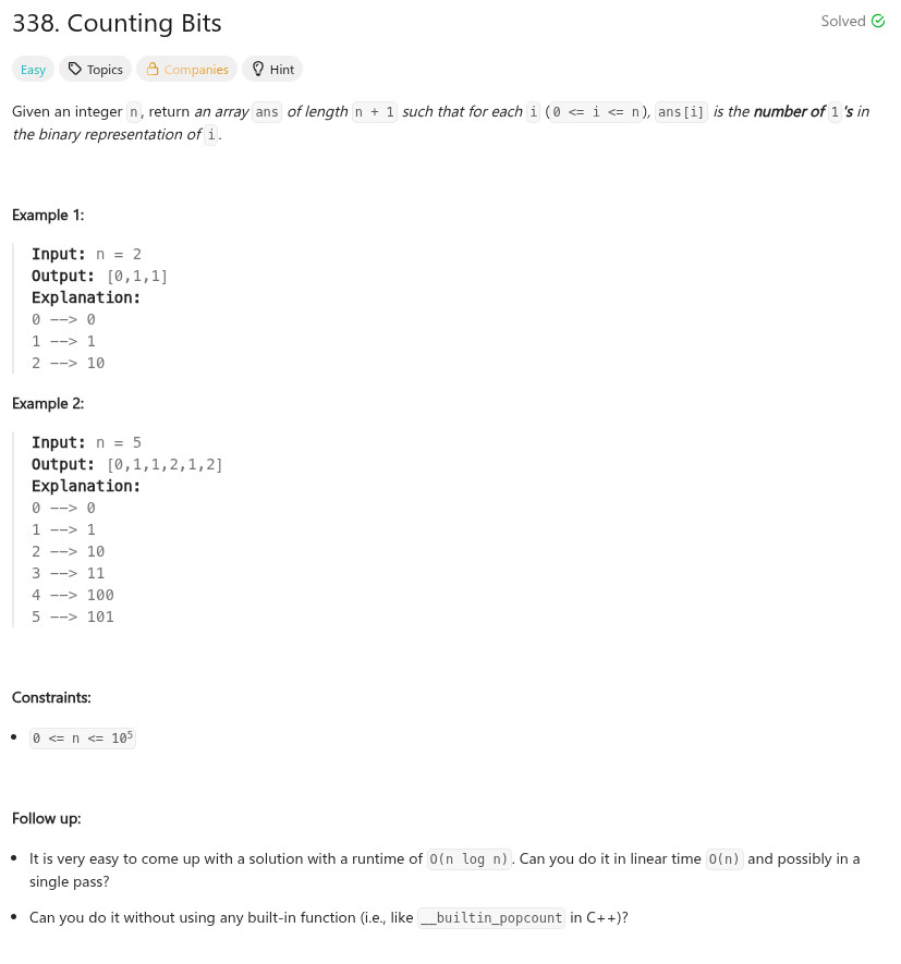 /** * Note: The returned array must be malloced, assume caller calls free(). */ int* countBits(int n, int* returnSize) { int c0 = 0; int c1 = 0; int *r = malloc(sizeof(int) * (n + 1)); *returnSize = n + 1; memset(r, 0, sizeof(int) * (n + 1)); for (c0 = 0; c0 <= n; c0++) { int val = c0; for (c1 = 0; c1 < 64; c1++) { r[c0] += (val & 1); val >>= 1; } } return r; }