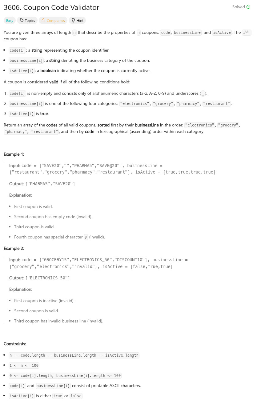 char** validateCoupons(char** code, int codeSize, char** businessLine, int businessLineSize, bool* isActive, int isActiveSize, int* returnSize)