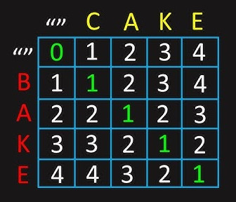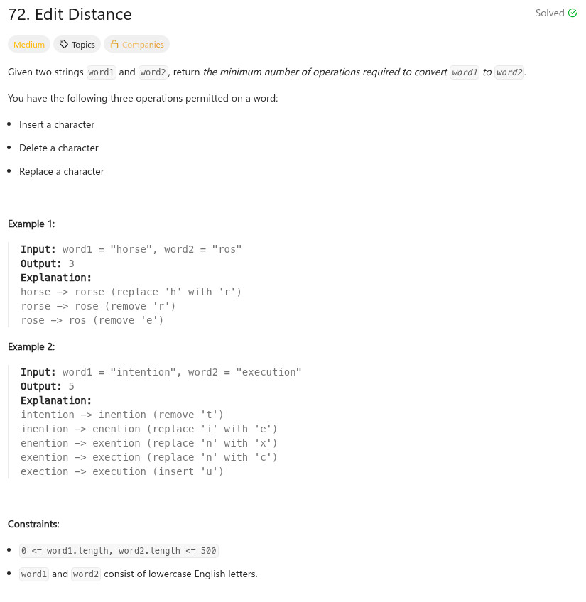int min(int a, int b) { return a > b ? b : a; } int minDistance(char *word1, char *word2) { int i = 0; int j = 0; int w1_len = strlen(word1); int w2_len = strlen(word2); int dp[501][501] = { 0 }; for (i = 0; i <= w1_len; i++) { dp[i][0] = i; } for (j = 0; j <= w2_len; j++) { dp[0][j] = j; } for (i = 1; i <= w1_len; i++) { for (j = 1; j <= w2_len; j++) { if (word1[i - 1] == word2[j - 1]) { dp[i][j] = dp[i - 1][j - 1]; } else { dp[i][j] = min(dp[i - 1][j - 1], min(dp[i - 1][j], dp[i][j - 1])) + 1; } } } return dp[w1_len][w2_len]; }