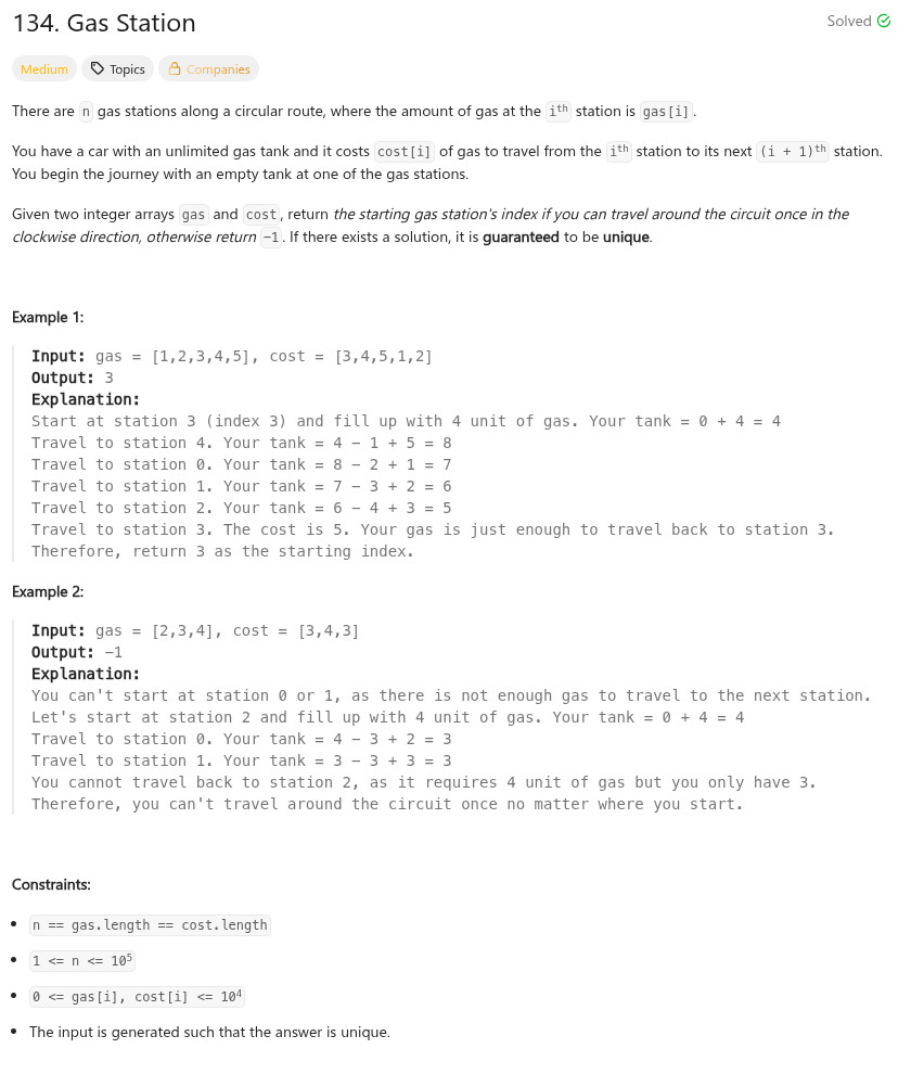int canCompleteCircuit(vector<int>& gas, vector<int>& cost) {