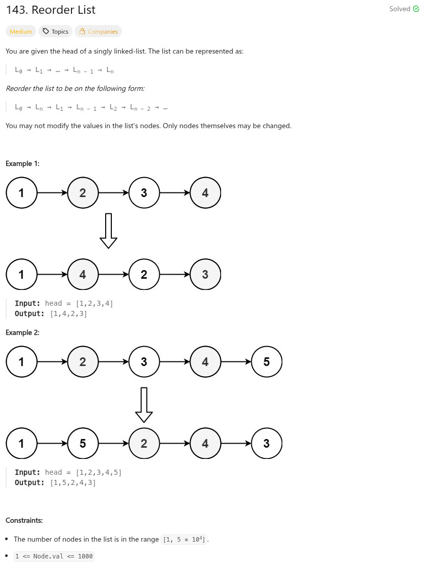1. 找中點(快慢指標) 2. 反轉後半段 3. 合併兩段(交錯)