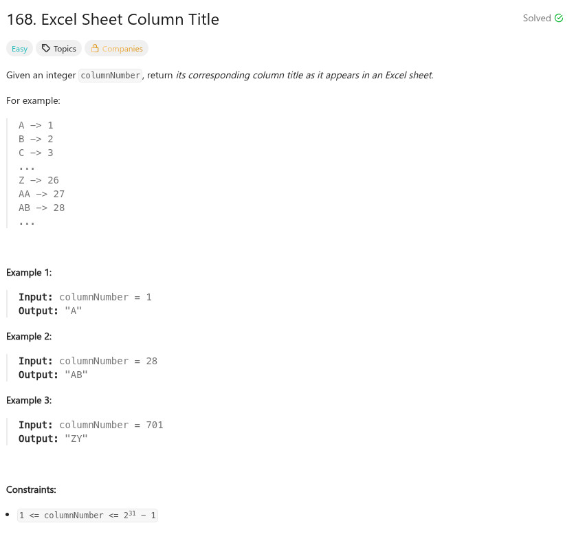 string convertToTitle(int columnNumber) {