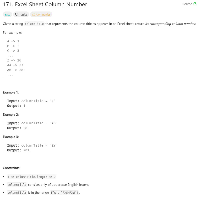 int titleToNumber(string columnTitle) {