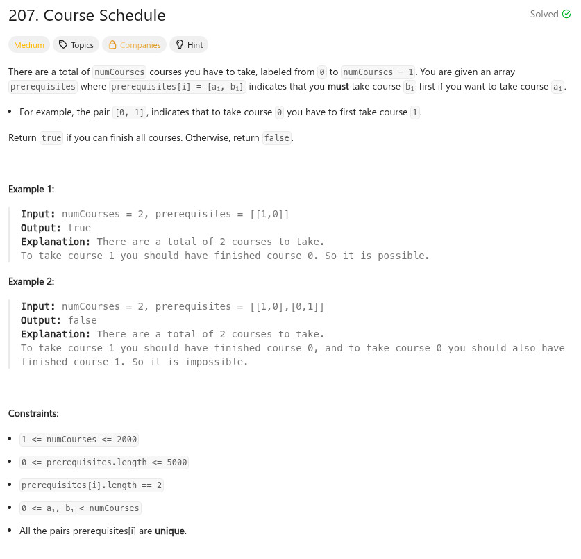 bool canFinish(int numCourses, vector<vector<int>>& prerequisites) {