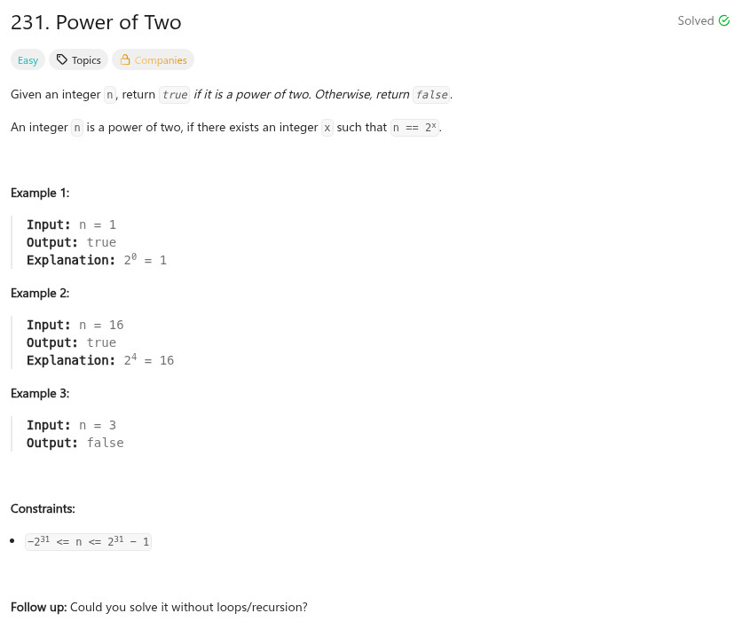 class Solution { public: bool isPowerOfTwo(int n) { return n > 0 && (n & (n - 1)) == 0; } };