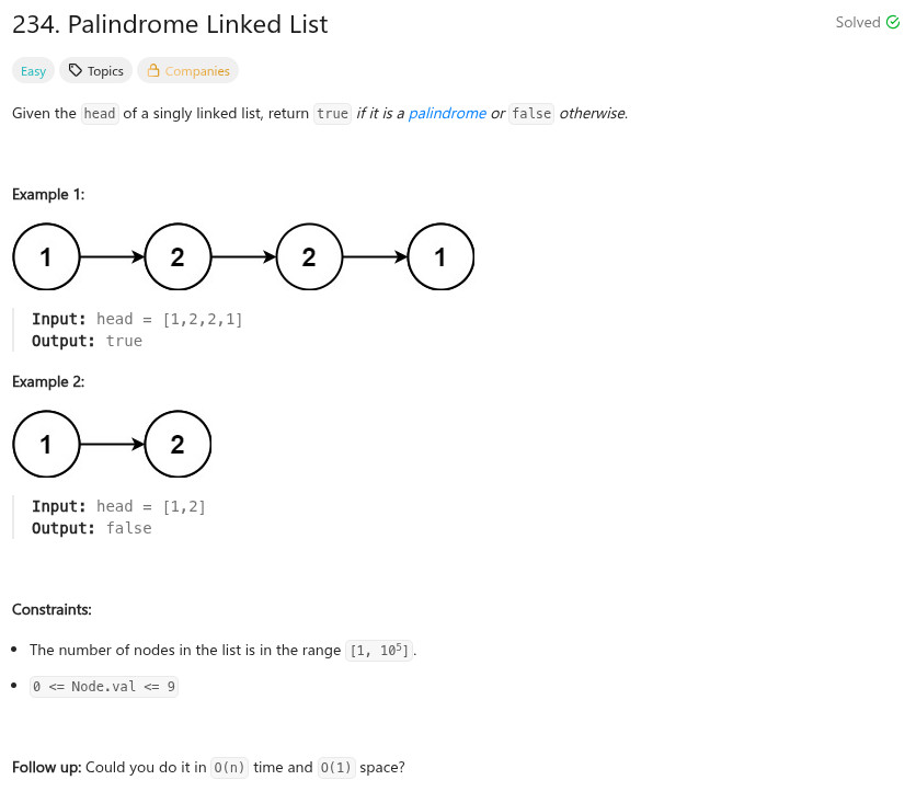 1. 找中點(快慢指標) 2. 反轉後半段linked list 3. 比較前半 vs 後半