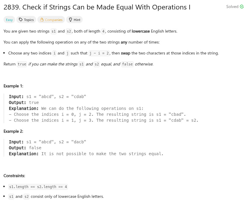 程式語言 - LeetCode - C++ - 2839. Check if Strings Can be Made Equal With Operations I