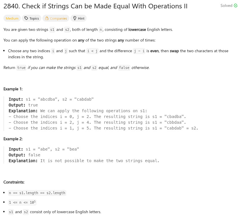 程式語言 - LeetCode - C++ - 2840. Check if Strings Can be Made Equal With Operations II