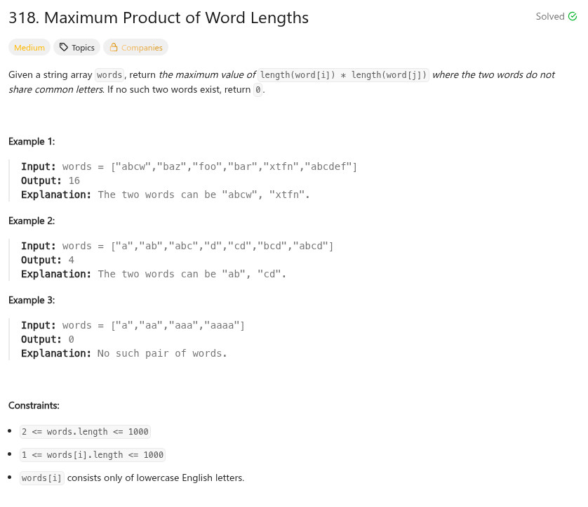 程式語言 - LeetCode - C++ - 318. Maximum Product of Word Lengths