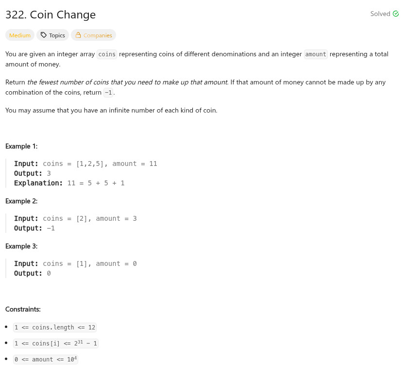 int coinChange(vector<int>& coins, int amount) {