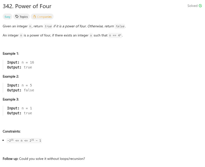 class Solution { public: bool isPowerOfFour(int n) { return (n > 0) && ((n & (n - 1)) == 0) && ((n & 0x55555555) != 0); } };